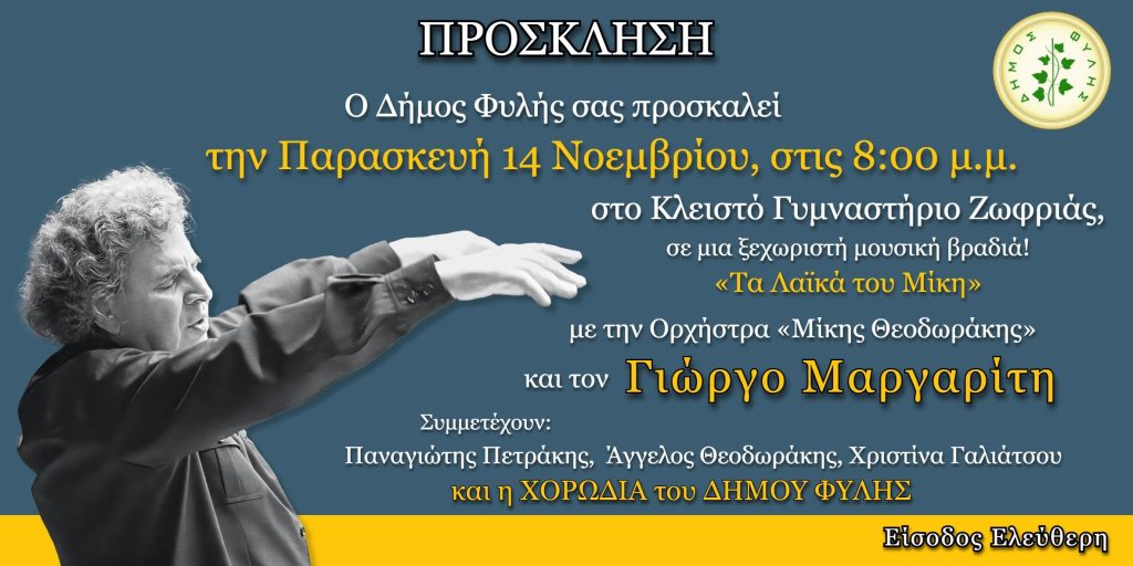 Την Παρασκευή 14 Νοεμβρίου 2025 στο Γ’ Κλειστό Γυμναστήριο Ζωφριάς του Δήμου Φυλής θα δοθεί μια ξεχωριστή μουσική παράσταση.