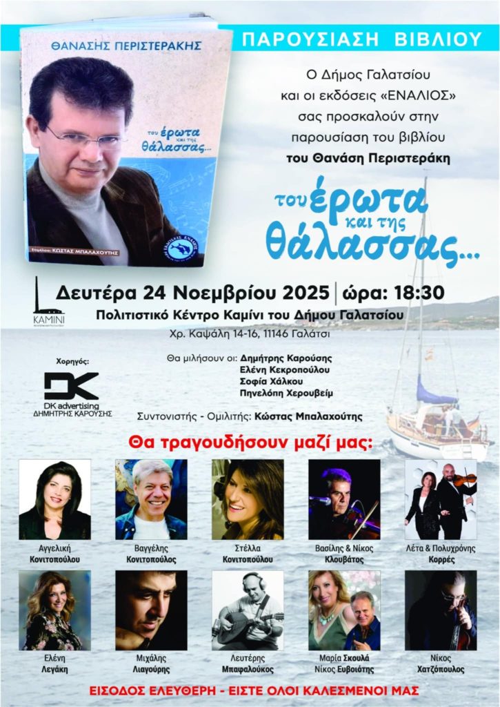 Τη Δευτέρα 24 Νοεμβρίου 2025, στο Πολιτιστικό Κέντρο Καμίνι του Δήμου Γαλατσίου (Χρ. Καψάλη 14-16), στις 18:30 με ελέυθερη είσοδο, παρουσιάζεται η βιογραφία του Θανάση Περιστεράκη.